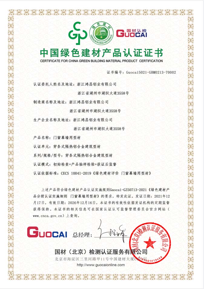 中國綠色建材產品認證證書-穿條式隔熱鋁合金建筑型材